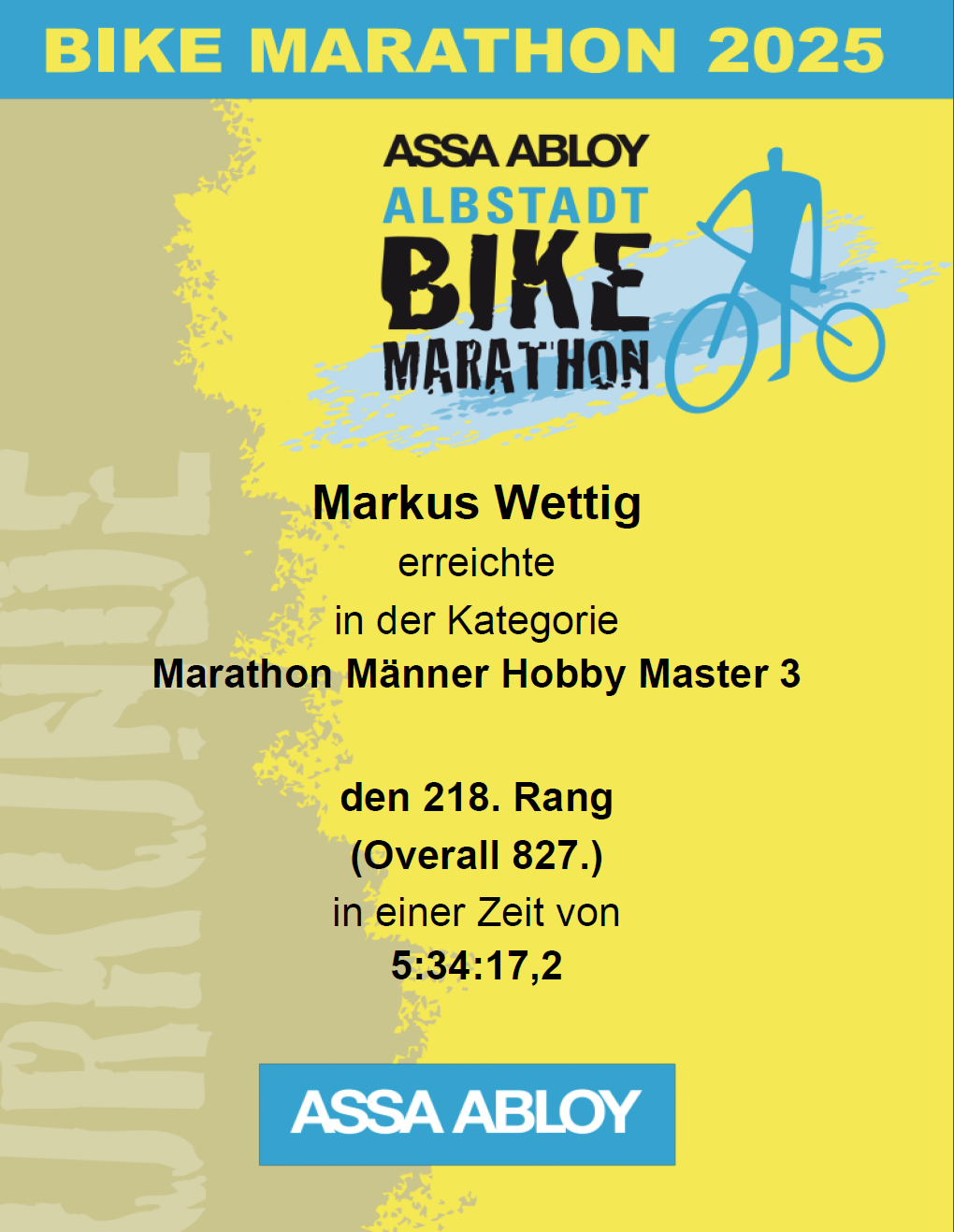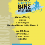Mountainbike Veranstaltungen 2025 Veranstaltung Albstadt-Bike-Marathon Datum 11.07.2025 Meine Platzierung Marathon Männer Hobby Master 3218. Platz (Overall 827) Distanz 83 km Ergebnis 5:34:17Ergebnisse 2024 Veranstaltung Albstadt-Bike-Marathon Datum 13.07.2024 Meine Platzierung 777. Platz Distanz 83 km Ergebnis 5:39:05Ergebnisse 2023 Veranstaltung Albstadt-Bike-Marathon Datum 08.07.2023 Meine Platzierung 888. Platz Distanz 83 km Ergebnis 5:24:34Ergebnisse Team ViZaar24 Go!!! Sprungschanze Noch wenige Meter ICH … …HABS… …GESCHAFFT!!! 2022 Veranstaltung MTB Veringendorf Datum 24.04.2022 Meine Platzierung 170. Platz Distanz 55 km Ergebnis 3:45:38Ergebnisse Am Start – Veringendorf 2022 – Lautertal Bald geschafft… Finished… Tour Silvester 2021 Route Eyachtal – Laufen – Felsemeer Lautlingen – Böllat Höhenmeter 540 Geschwindigkeit Ø 12,9 km/h Distanz 23,3 km Zeit 1:48 Blick auf Laufen Eyachtal Felsenmeer Baum mit Fels Bei Margrethausen Brunnen bei Margrethausen Bei Pfeffingen Im Wald bei Pfeffingen Blick vom Böllat Mountainbike Veranstaltungen 2021 Veranstaltung MTB Classic Albstadt Datum 30.10.2021 Meine Platzierung 75. Platz Distanz 42 km Ergebnis 2:38:05Ergebnisse